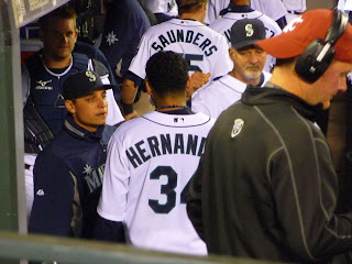 M's hanging out in the dugout! (Too bad the camera man is a coug... bloody coug...)